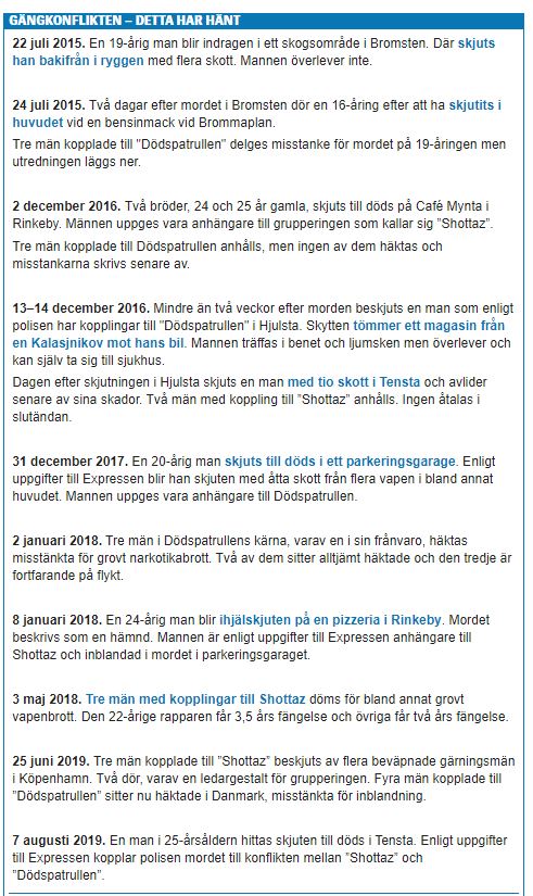De svenske avisene fortsetter med å liste opp lignende drap og hevndrap i de utenlandske miljøene. Akkurat disse drapene har sin opprinnelse i to mord som fant sted i 2015, mellom «Shottaz» og «Dødspatruljen».