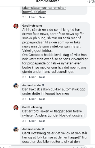 – Ahhh, så når en side som i lang tid har drevet fake news så tror du altså mer på propagandaen til siden som sprer fake news enn de som avdekker sannheten, var svaret Hofsvang ga en person som linket til en Resett-sak.