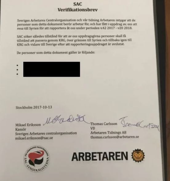 I mannens leilighet fant man også et «verifikasjonsbrev» fra SAC Syndikalisterna (Sveriges Arbetares Centralorganisation). Dette er radikale fagforeninger som ønsker revolusjon og avvikling av kapitalismen. Organisasjonen blir hyllet i Norge av blant annet det venstreekstreme nettstedet Radikal Portal, ved redaktør Joakim Møllersen.