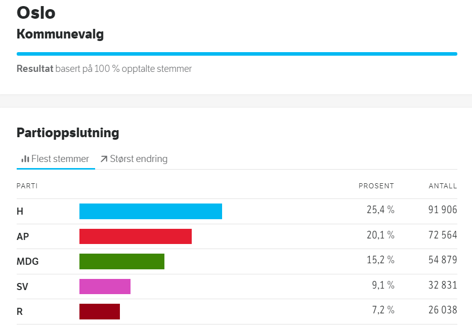 Miljøpartiet De Grønne, Sosialistisk Venstreparti og Rødt har til sammen 31.5 prosent av stemmene ved kommunevalget i Oslo.