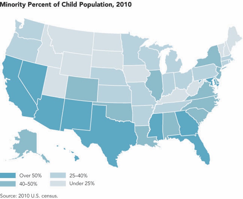 Hvite amerikanere er nå i mindretall i alle aldersgrupper under 11 år. I Europa er hvite i mindretall i den samme aldersgruppen i byer som London, Birmingham, Malmø, Berlin, Amsterdam, Brugge og andre storbyer. Selv i Oslo nærmer antall skoler med en minoritet av norske skolebarn seg tresifret antall.