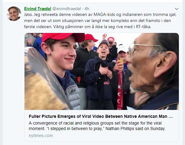 Og slik forsøkte man å lure hele folket med de «rasistiske hvite skoleungdommene med røde capser» i den amerikanske hovedstaden. Det ble en gedigen fiasko og betegnelsen «Fake News» har satt seg enda hardere hos befolkningen, som allerede hadde en lav tiltro til dem.